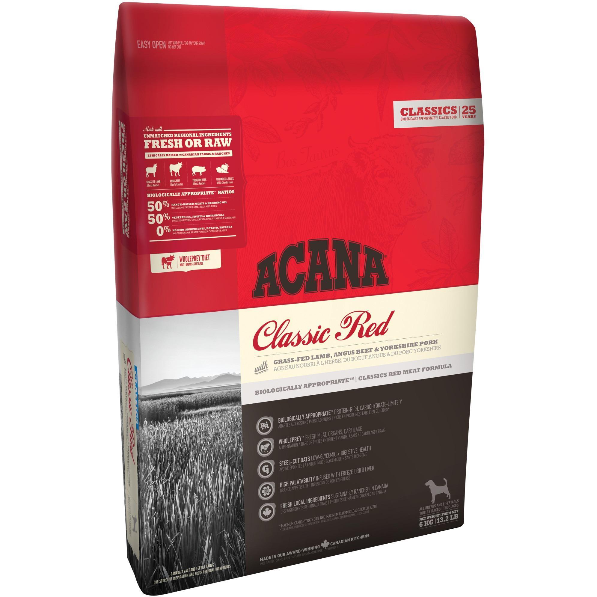 Brimming with richly nourishing meats, ACANA Classic Red dog food features local ranch-raised Angus beef, Yorkshire pork and grass-fed lamb that are delivered FRESH or RAW daily in WholePrey ratios to nourish your dog completely.