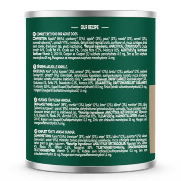 This seriously meaty, complete and balanced meal is made with rabbit blended with fruit and vegetable superfoods, including apple, carrots, swede and spinach. All gently cooked inside the can to lock in the goodness and flavour that your dog will love.