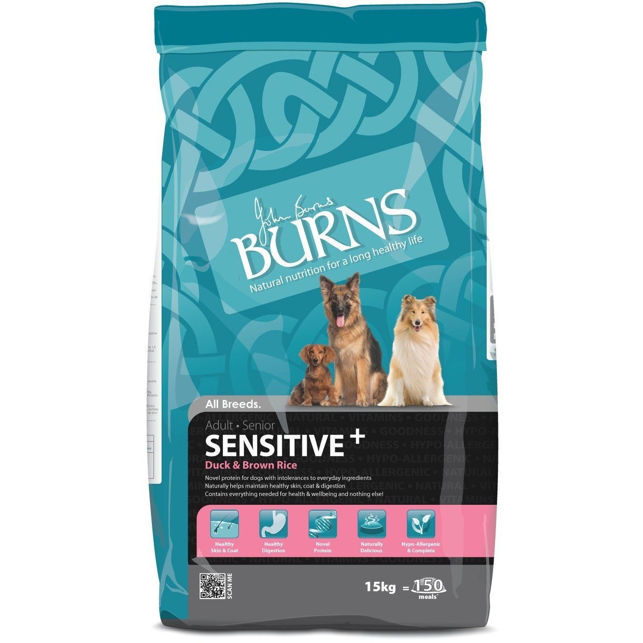 Burns Sensitive+ is hypo-allergenic, so it is suitable for sensitive dogs. It is formulated without ingredients such as wheat, soya, dairy, artificial colourings and artificial preservatives which are known to cause symptoms of food intolerance including itchy skin, digestive upset, excessive moulting, full anal glands and waxy ears.
