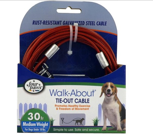 Four Paws Mediumweight dog tie out cable. 20 foot vinyl coated rust proof aircraft cable tie out with Bronze Snaps. Suitable for Dogs under 20kgs